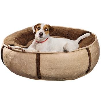 - These round dog beds feature faux bomber leather